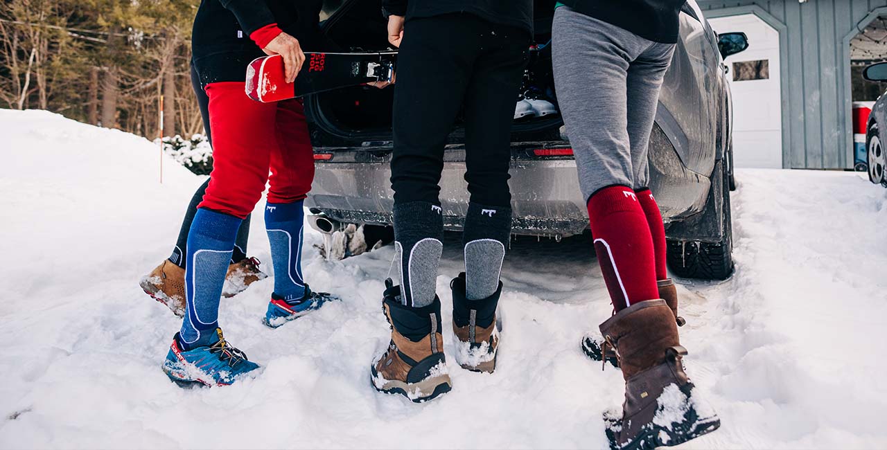 group of people getting ready to go skiing wearing base layer bottoms and ski and snowboard socks
