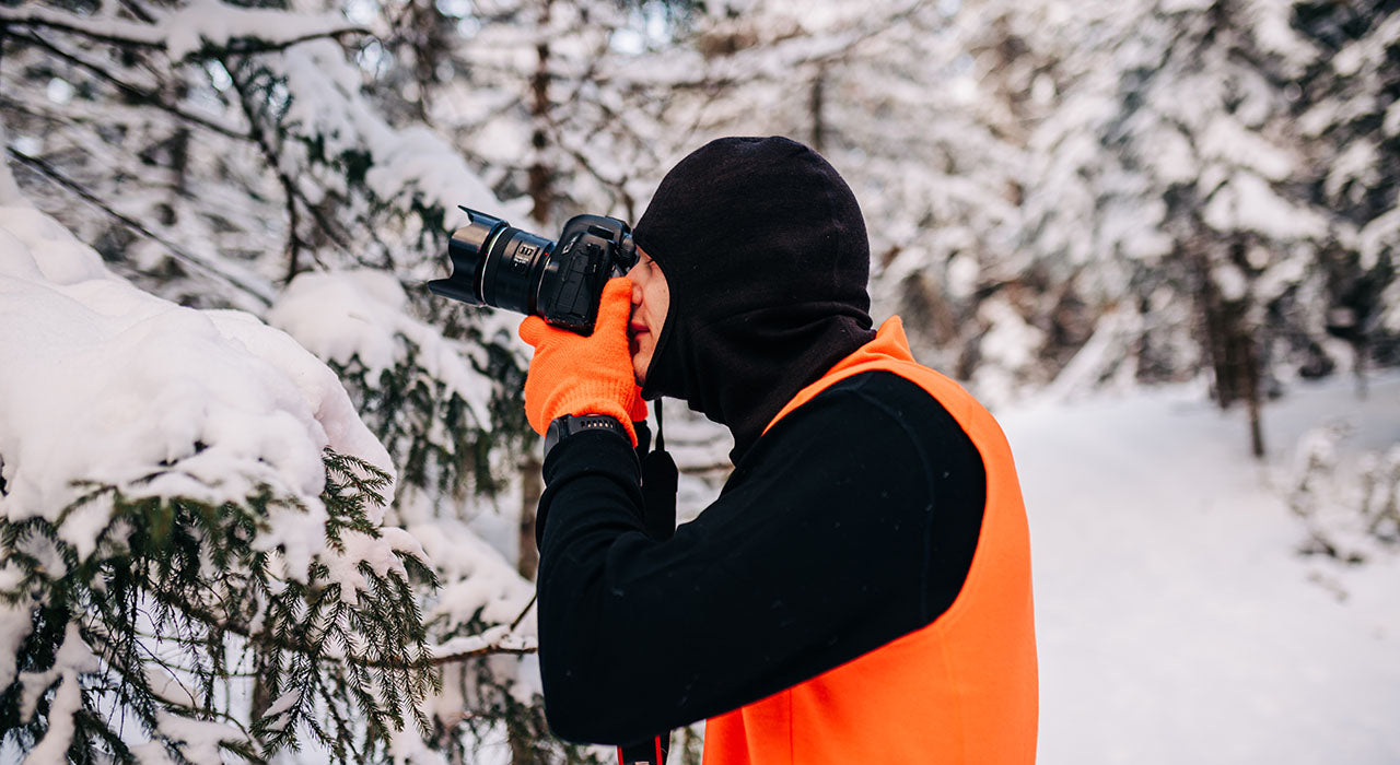 man taking winter photos wearing expedition base layers