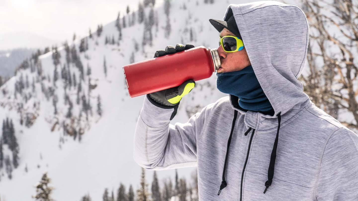 man drinking water in the snow while wearing minus33 merino wool expedition weight hoodie sweatshirt