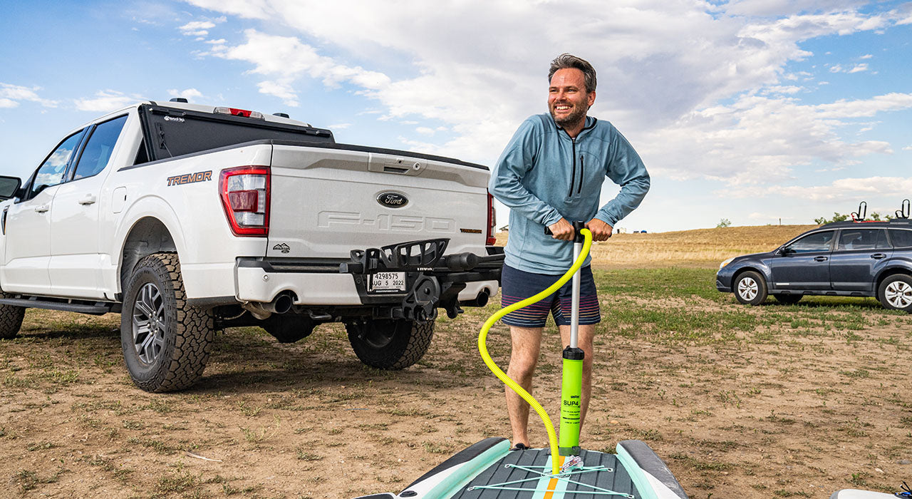 man pumping up paddle board wearing woolverino micro weight mid layer sun hoodie in color slate blue