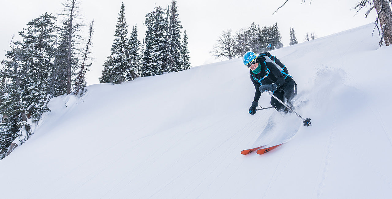 woman skiing wearing kodiak fleece expedition hoodie