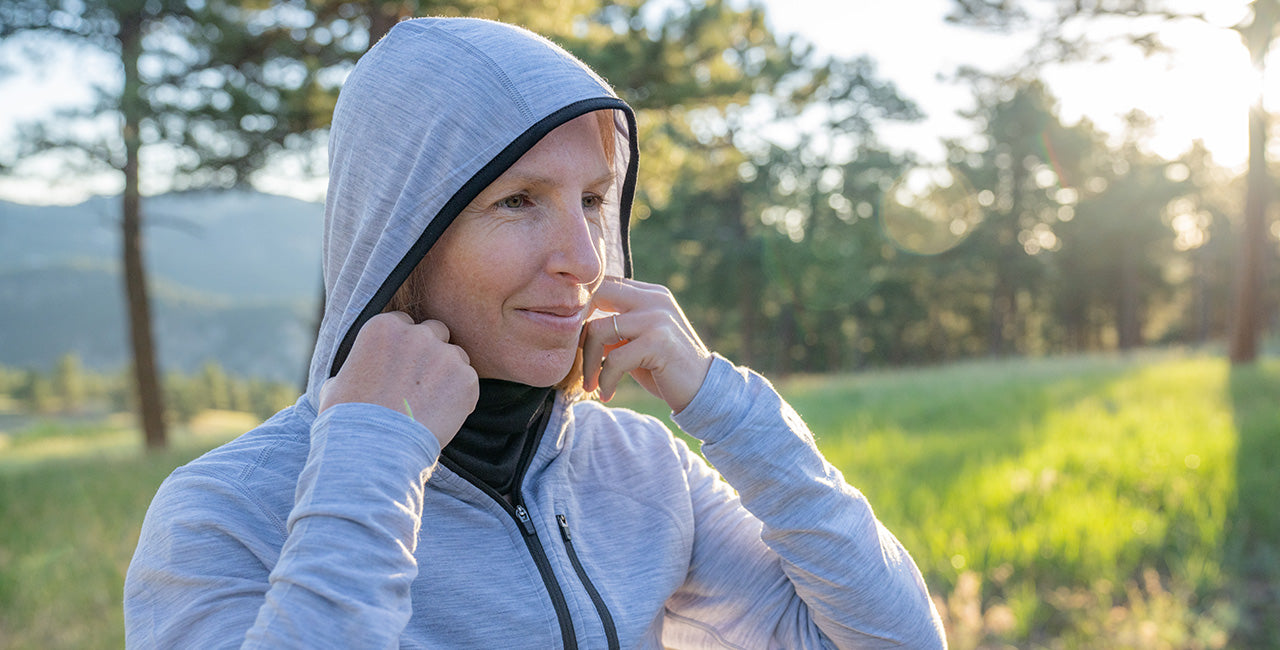 woman wearing woolverino micro weight sun hoodie and multiclava