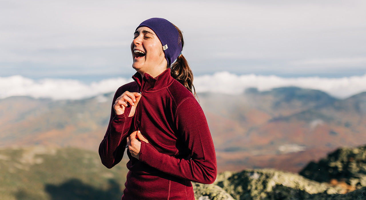 woman hiking in the fall wearing midweight base layers and reversible headband